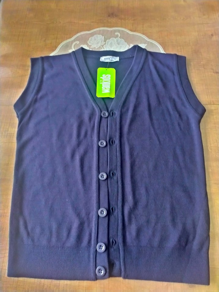 Erkek çocuklar için düğmeli, V yaka, kolsuz süveter. Sentetik kumaştan, düz mavi-gri renkte, normal kesim, günlük kullanıma uygun.