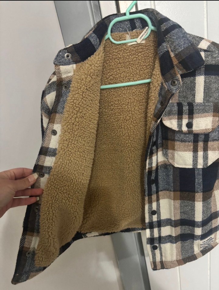 Erkek çocuk için gri ve kahverengi ekose desenli, düğmeli, rahat kesim kaban. Yumuşak ve sıcak kumaş astarlıdır, sokak tarzı için uygun.