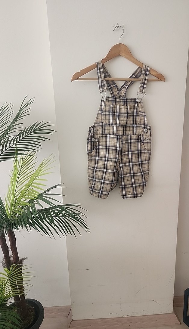 Yumuşak pamuktan yapılmış, gri ve kahverengi ekose desenli, bol kesim erkek çocuk tulumu. Ayarlanabilir tokalı askılarla rahat sokak stili sunar.Parmağımla gösterdiğim yere dikkat