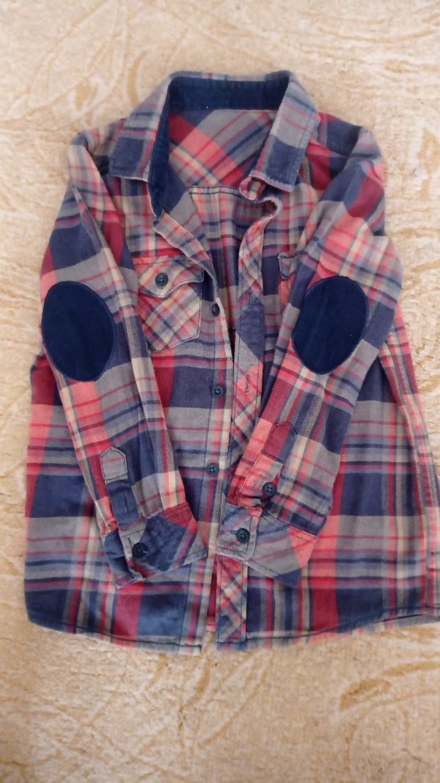 Erkek çocuk için düğmeli, uzun kollu, bol kesim ekose desenli gömlek. Notched lapel yakalı ve dirseklerde detayları vardır.