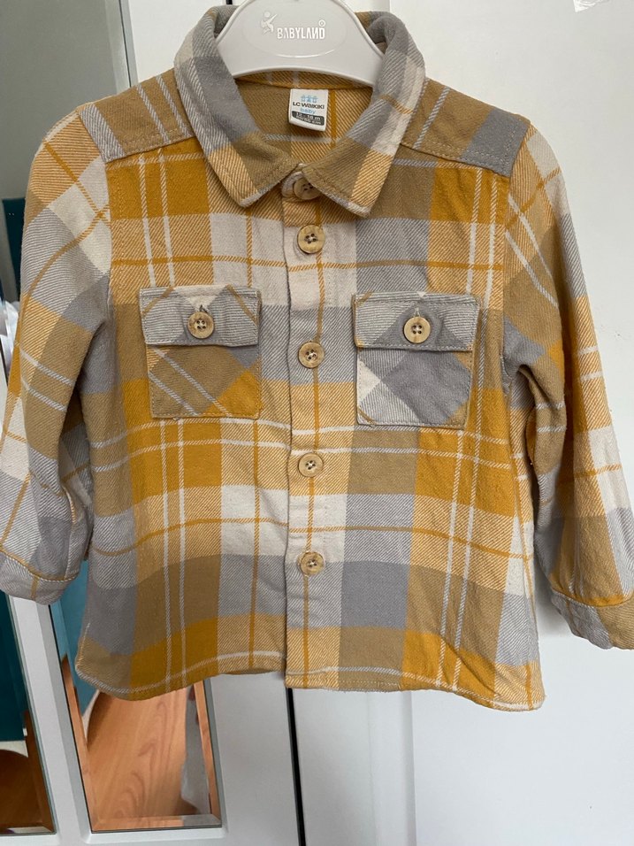 Erkek çocuklar için bol kesim, düğmeli, uzun kollu ve yakalı gömlek. Bej ve gri ekose desenli, yumuşak ve sıcak dokulu kumaş.