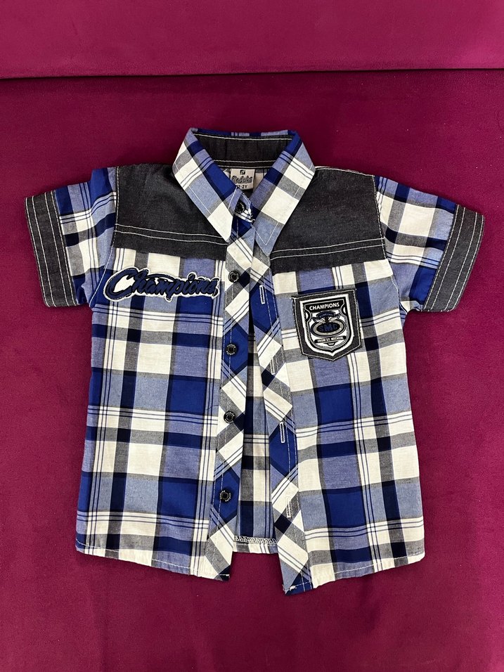 Erkek çocuklar için kol düğmeli, kısa kollu ve yakalı gömlek. Pamuklu, mavi ve gri ekose desenli, rahat kesim ve günlük tarz için uygun.