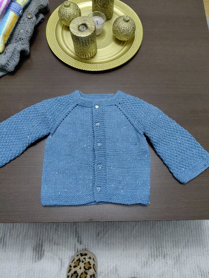 Mavi renkli, uzun kollu, elörgüsü yapılmış ve rahat kesime sahip erkek çocuk hırkası. Desensiz ve sade tasarıma sahiptir.