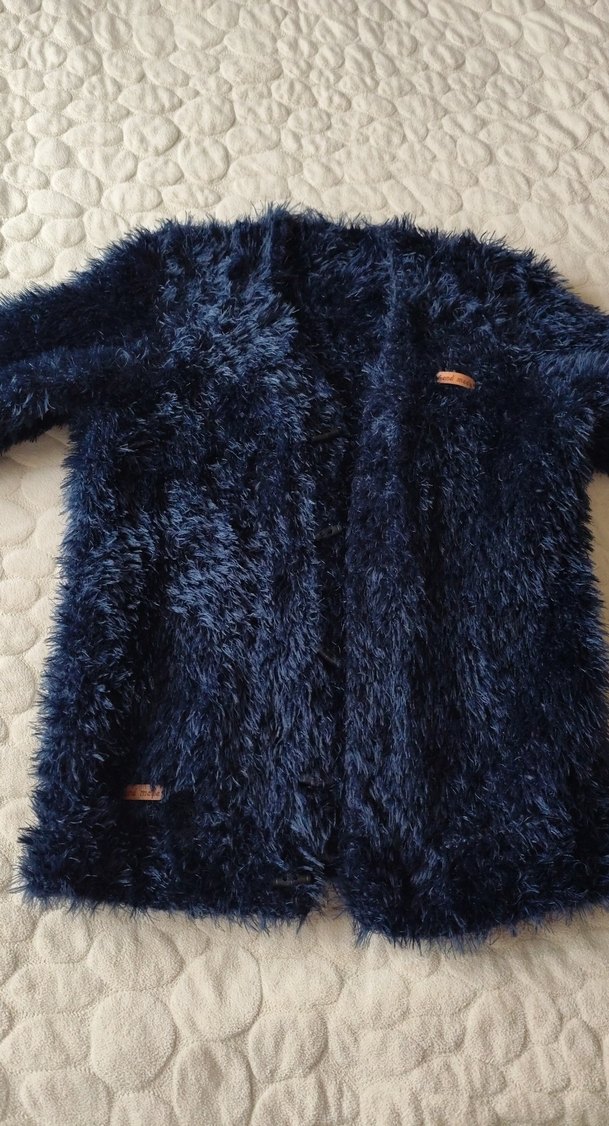 Koyu mavi peluş dokulu, rahat kesim ve kesik yaka detaylı,oğluma küçüldü,elde örüldü örgüsü çok güzel, yumuşacık ve kalın soğuk havalarda rahatlıkla giyilir.