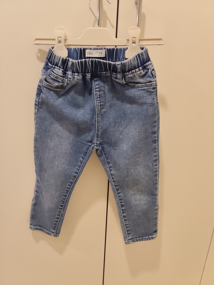 Erkek çocuklar için elastik bel bantlı, mavi-gri tonlarında, sade desenli ve sokak stiline uygun fit kesim denim pantolon.