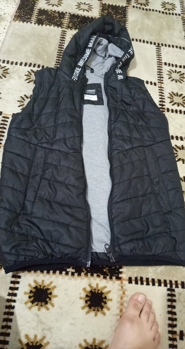 Gri renkte, fermuarlı ve kapüşonlu, yüksek yakalı erkek çocuk yeleği. Sentetik kumaştan, sade ve dar kesim, trend sokak stiline uygun. sayılı giyildi sorunsuzdur