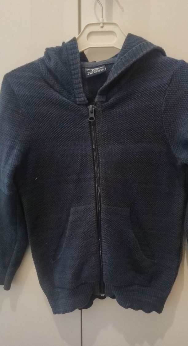 Erkek çocuklar için fermuarlı, uzun kollu, lacivert renkte triko hırka. Kapüşonlu ve ön cepli, streetwear tarzında, vücuda oturan kesim.