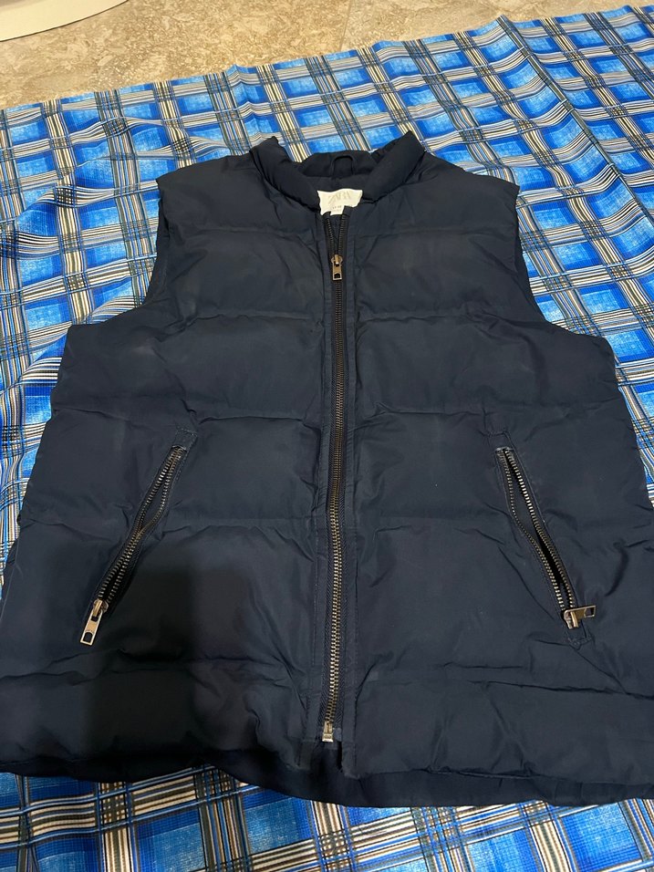Fermuarlı cepleri ve yakalı tasarımıyla, yumuşak ve sıcak kumaştan yapılmış koyu mavi erkek çocuk yeleği. Sokak stiline uygun.