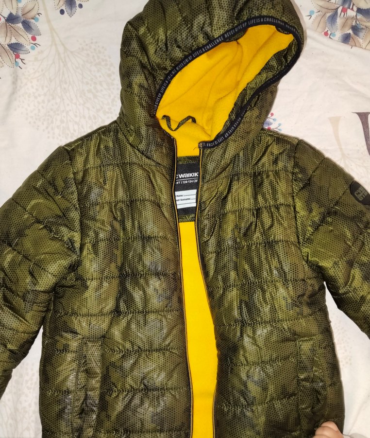 Fermuarlı, sarı iç astarlı, koyu yeşil dış yüzeyli, notched lapel detaylı, erkek çocuk için fitted street wear mont. Haki yeşili çok şık bir mont fermuar yapılacak bu de kollarında ufak deformeler var ihtiyac fazlası olduğundan yaptırmadım o yüzden fiyatı makul koydum