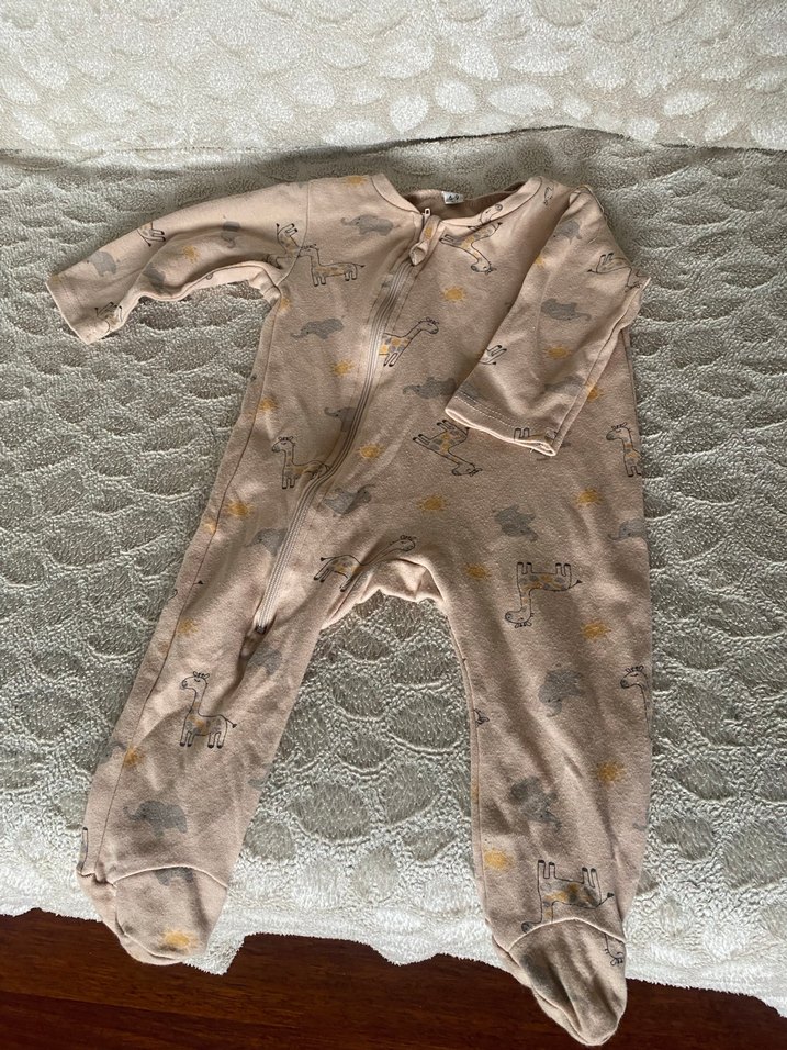 Pastel kahverengi, uzun kollu, kruvaze yaka ve fermuarlı kız çocuk pijaması. Yumuşak dokulu ve hafif hayvan desenli.