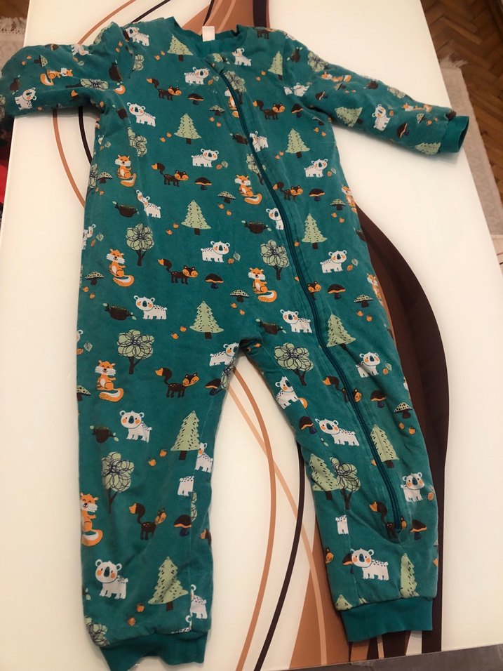 Fermuarlı, uzun kollu ve yüksek yakalı, koyu yeşil renkli, hayvan ve ağaç desenli erkek çocuk pijama tulumu.