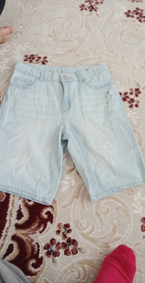 Pastel mavi renkli, loose fit kesim kısa mini denim şort, hafif yırtık detaylarıyla günlük rahat sokak stili sunar.