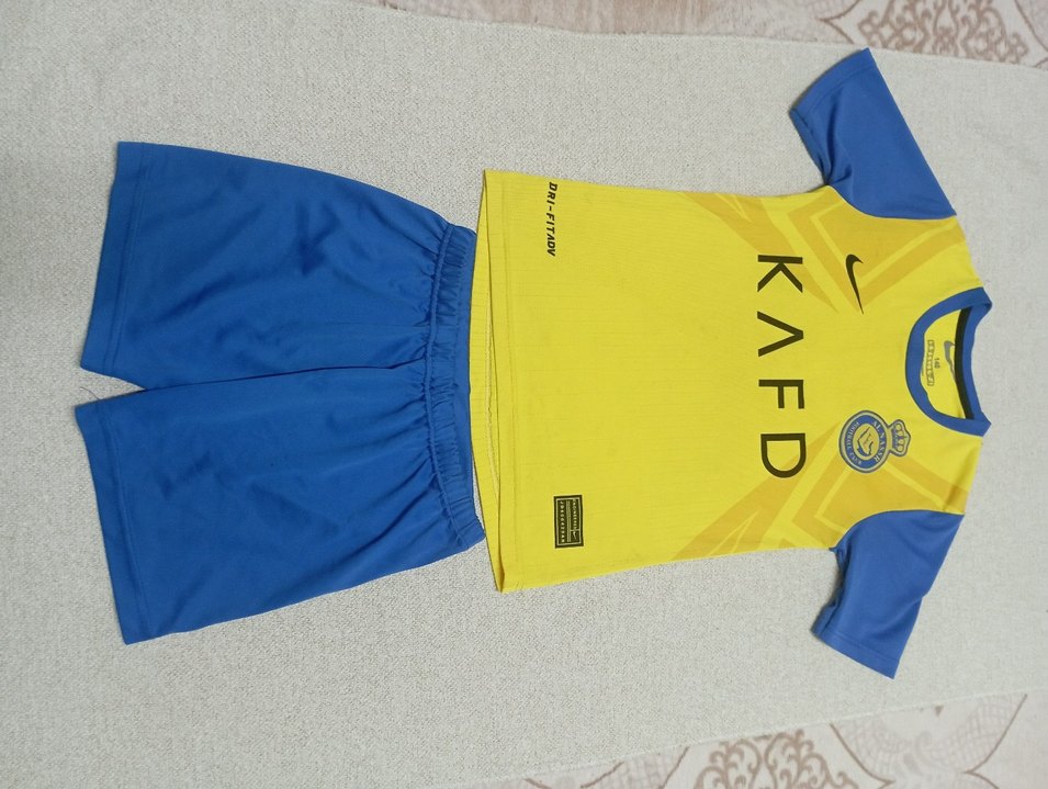 Renkli baskılı sarı erkek çocuk firma , kısa kollu ve 'KAFD' ile 'DRI-FITAD' yazılıdır. Mavi şortu ile uyumludur. 7 8 yaşa uyumlu