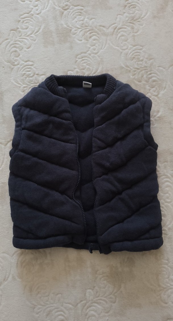 Erkek çocuklar için koyu gri renkte, yüksek yakalı ve dar kesim kolsuz yelek. Yumuşak, sıcak kumaştan, örgü dokulu.