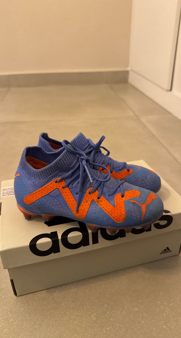 Koyu mavi zemin üzerine turuncu baskılı detaylar ve cırt cırtlı kapama özelliği olan futbol ayakkabısı. Kauçuk tabanlı, spor ve athleisure tarzına uygun. ⚽ 30numara cok az giyildi isvecten hediye geldi kutusu yok