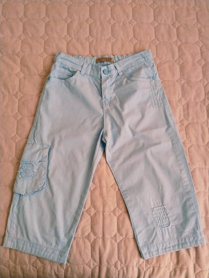 Erkek çocuklar için bol kesim, pastel mavi kot pantolon.Belinde küçuk bir dikiş kusuru vardır.13-14 yaştır.Ama 12 yaş için daha uygundur.