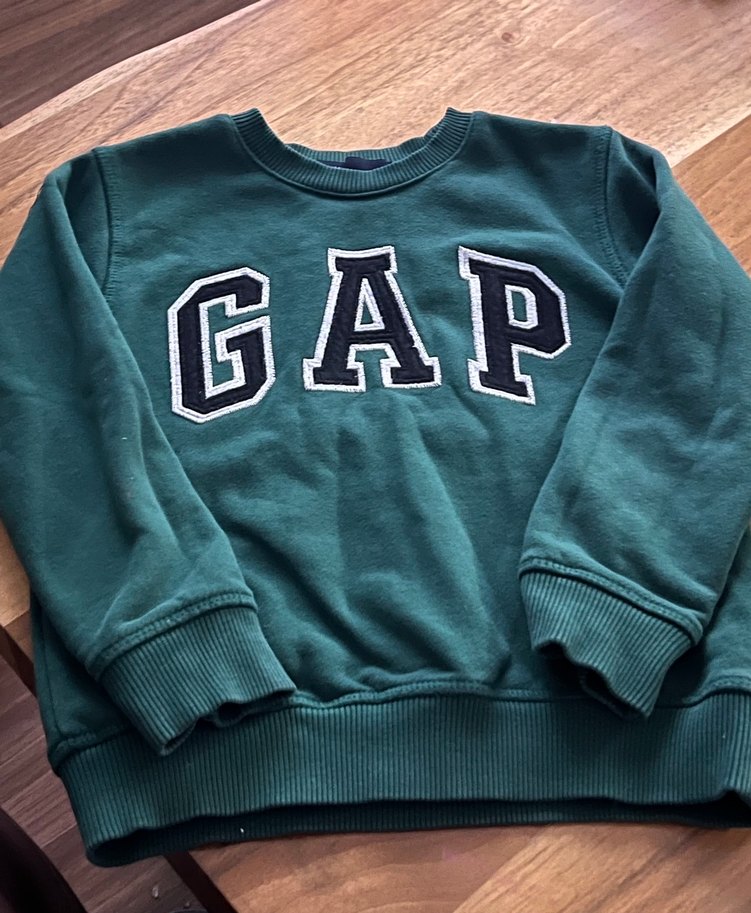 Koyu yeşil renkli, uzun kollu, yuvarlak yakalı erkek çocuk sweatshirtü. Bol kesim ve yumuşak iç yüzeyli, önünde GAP baskısı ve fermuarlı detay bulunur.