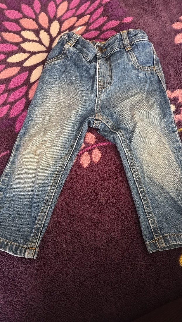 Geniş kesim, batik desenli gri-mavi kot pantolon, tokalı detaylarla trend bir günlük stil sunar. beli lastıklı ayarlanabılır