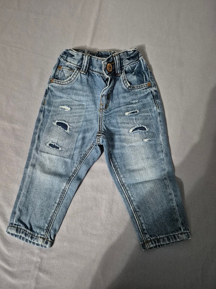 Mavi-gri tonlarında, geniş kesim, tokalı ve yırtık detaylı erkek çocuk denim pantolon.