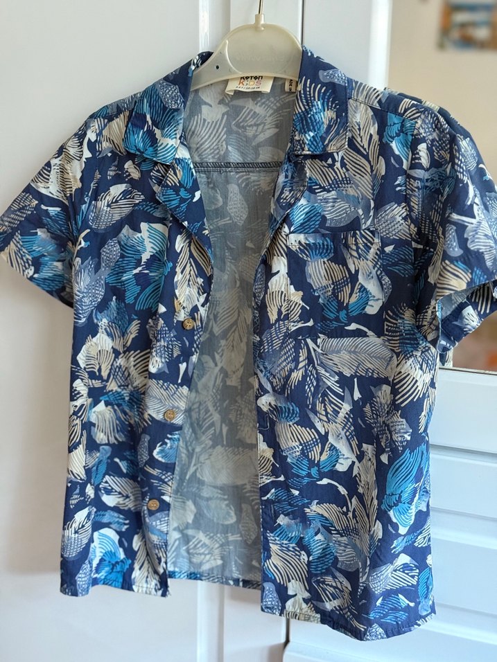 Erkek çocuk için düğmeli, kısa kollu, yakalı ve mavi-gri tonlarda desenli bol kesim gömlek. Normal midi boyda, gündelik kullanım için uygundur.