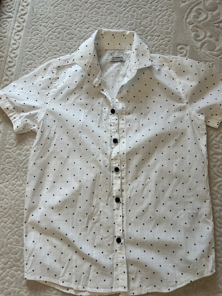 Beyaz pamuklu kumaştan, siyah puantiyeli, kısa kollu, yakalı ve düğmeli önü olan bol kesim gömlek. Günlük sokak stiline uygun.