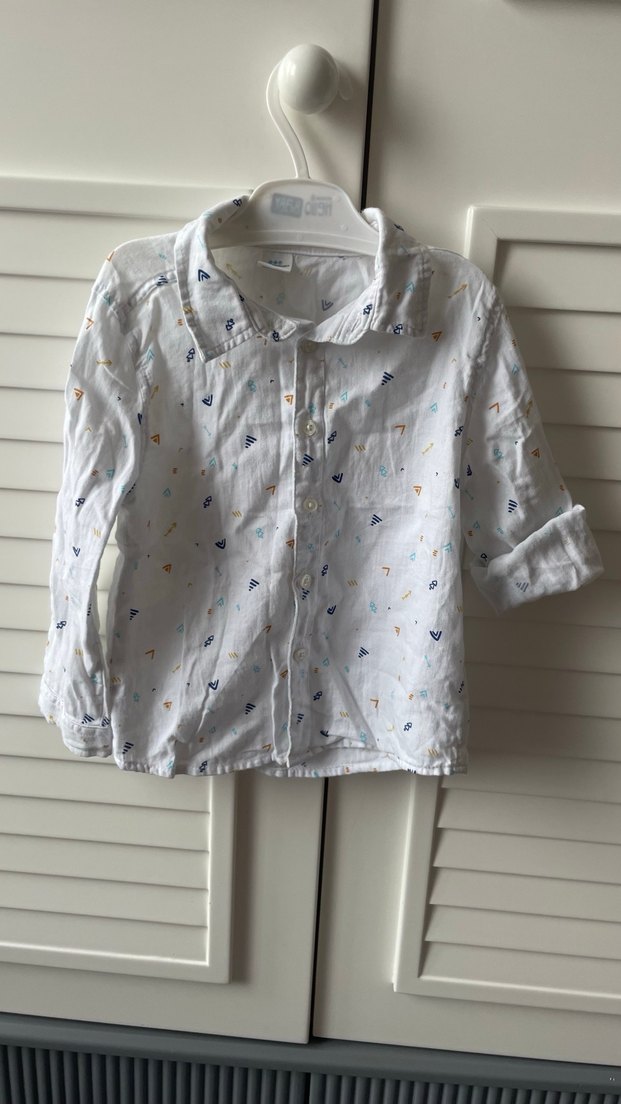 Erkek çocuk Gömlek beyaz üstüne desenleri olan.