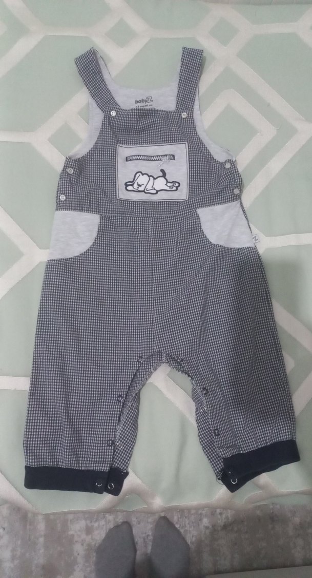 Gri renkli, askılı ve kancalı erkek çocuk tulumu. Yumuşak ve sıcak kumaş, yan cepler ve bacaklarda çıtçıt düğmeler bulunur.