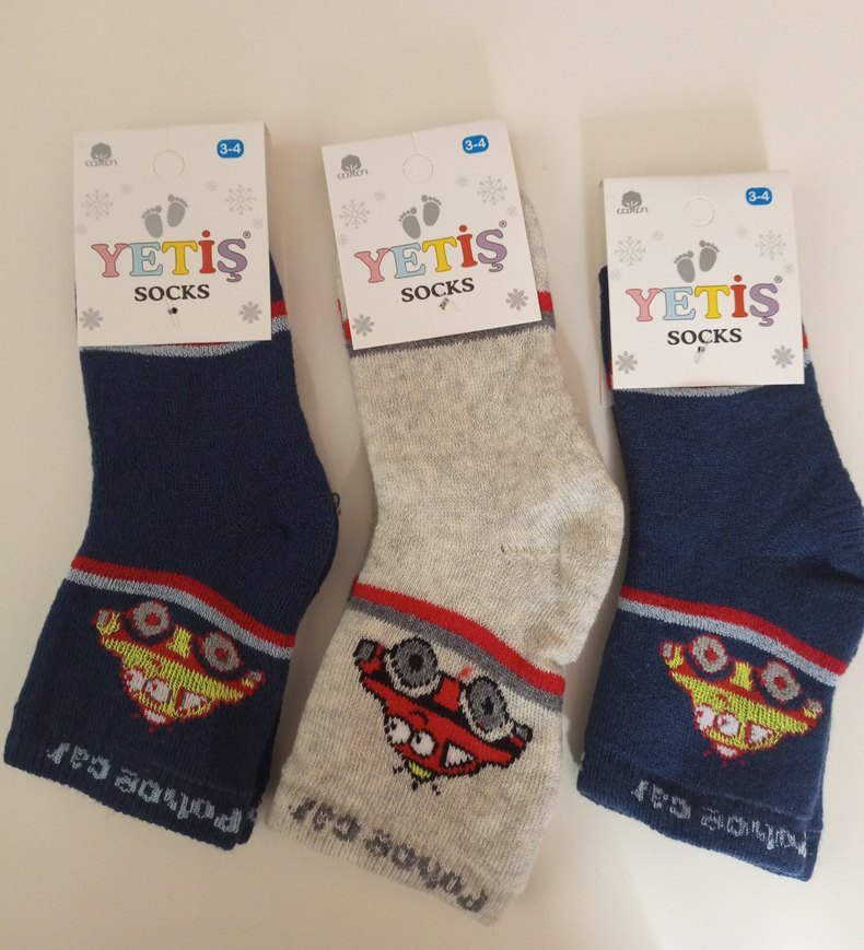 Erkek çocuk için gri baskılı, yumuşak dokulu havlu çoraplar. 3-4 numara, Yetiş Socks markalı.