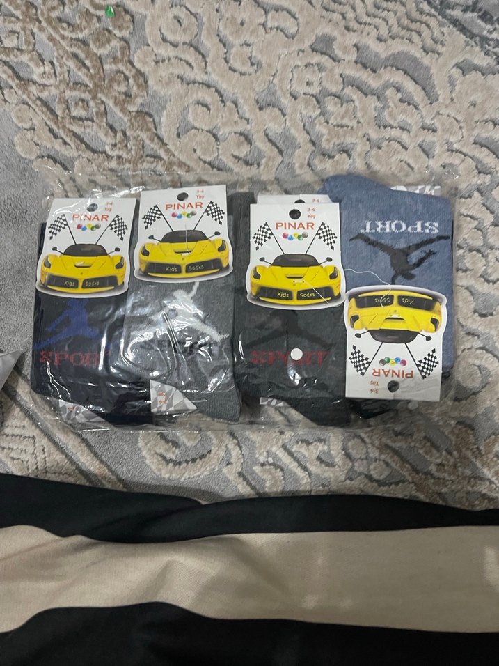 PINAR markalı, üzerinde baskılı araba ve spor desenleri bulunan gri erkek çocuk çorap seti. Üzerinde 'INAR' yazısı yer alır.