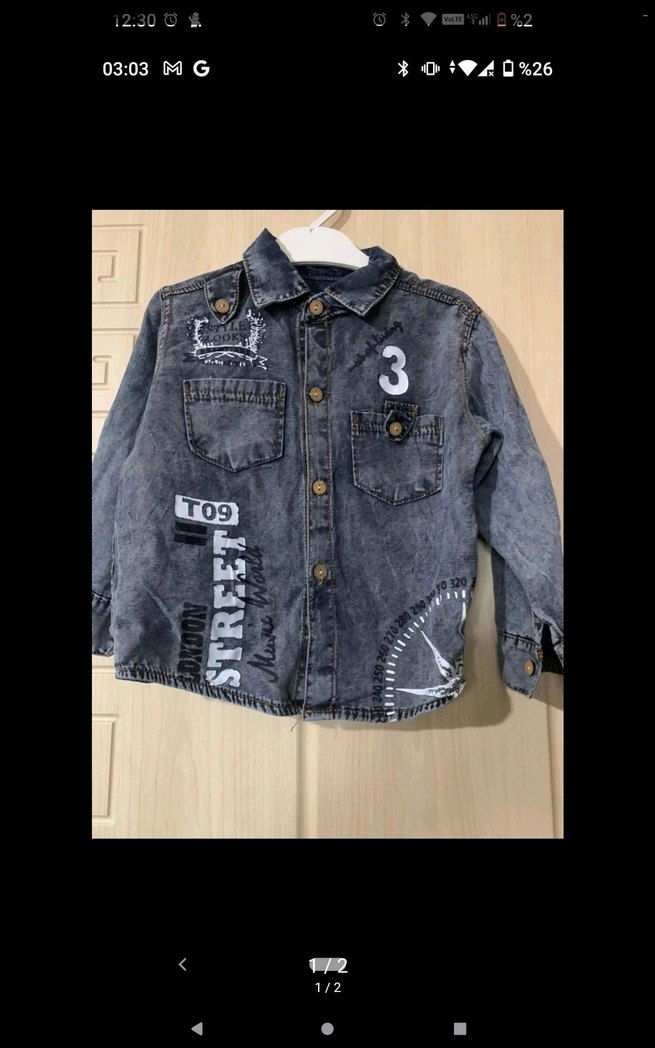 Bu erkek çocuk ceketi, bol kesim ve düğmeli önü ile notlu yaka detayına sahiptir. Denim kumaştan yapılmış, gri renkte ve baskılı sokak stili desenleri içerir.