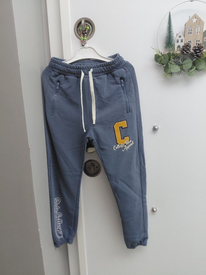 Gri renkli, baskılı detaylı ve fermuarlı cepli erkek çocuk eşofmanı, bağcıklı bel ile rahat kullanım sağlar.