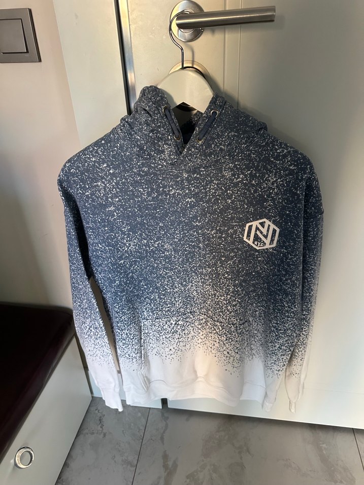 Erkek çocuk için gri baskılı, kapüşonlu, uzun kollu, bol kesim, yumuşak örme kumaşlı sweatshirt.