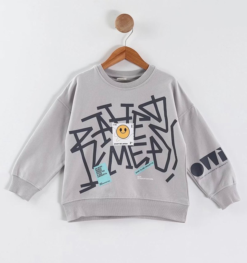 Gri renkli, baskılı ve uzun kollu erkek çocuk sweatshirtü, rahat kesimi ve yuvarlak yaka detayıyla yumuşak kumaştan üretilmiştir.