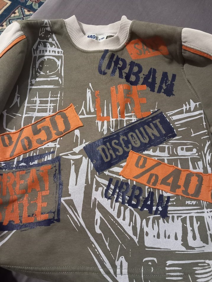 Gri renkli, uzun kollu, yuvarlak yakalı, bol kesim erkek çocuk sweatshirtü. Üzerinde şehir temalı baskılar bulunur. 4 5 yaş uyumlu
