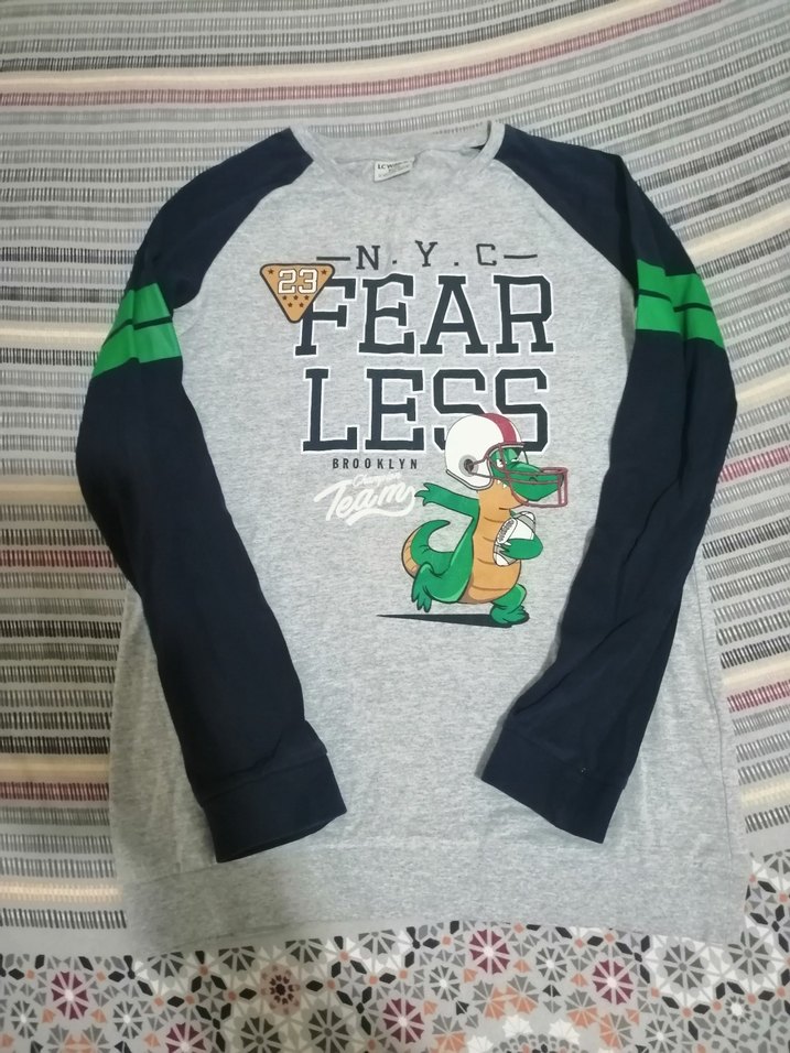 Erkek çocuk için uzun kollu, bisiklet yaka ve bol kesim gri baskılı sweatshirt. Koyu kollarda yeşil şeritler ve yumuşak, sıcak kumaş ile velcro detaylıdır.