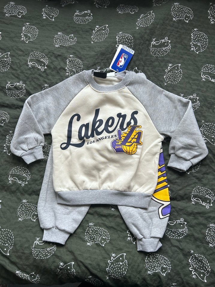 Gri ve krem renklerde, yumuşak fleece kumaştan, bol kesim, uzun kollu, baskılı Lakers desenli erkek çocuk sweatshirtü. Rahat ve günlük kullanıma uygun.