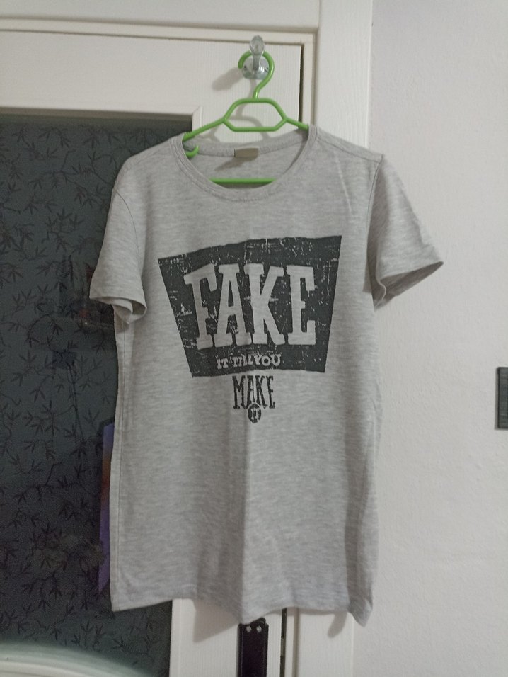 erkek ocukları için gri renkli, bol kesim, kısa kollu ve yuvarlak yakalı tişört. "FAKE" baskılı ve tokalı detaylı, trend sokak tarzına uygun.