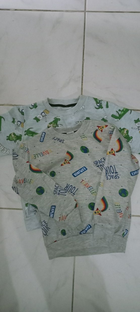 Uzun kollu, bisiklet yaka ve bol kesim erkek çocuk sweatshirtleri. Yumuşak sentetik kumaştan, örme dokuda, dinozor ve uzay temalı baskılar içerir. Sokak stiline uygun.