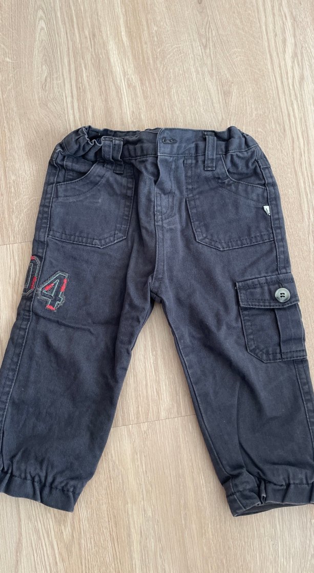 Erkek çocuklar için düğmeli, cepli, bol kesim koyu gri denim pantolon. Rahat ve sokak stili için uygun.