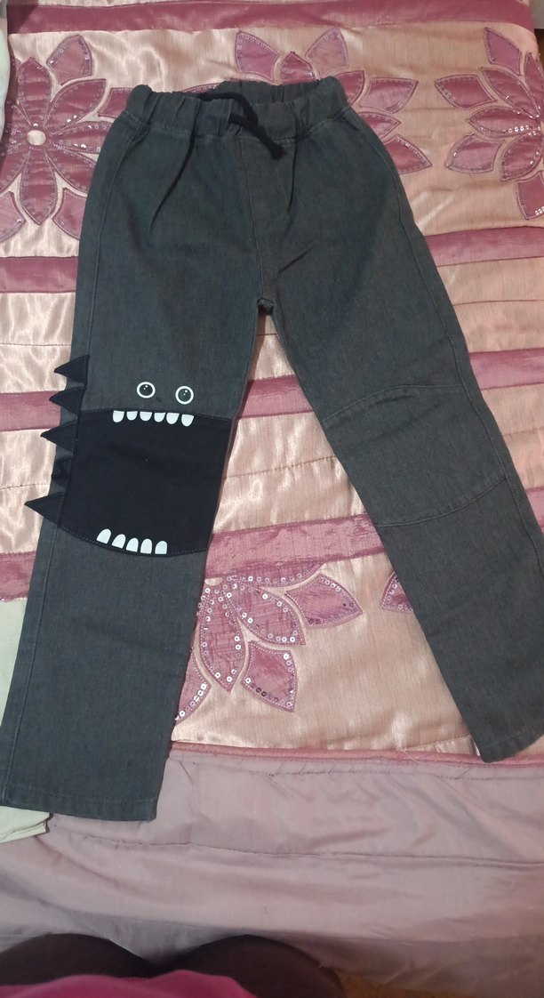 Erkek çocuklar için bol kesim, gri kot pantolon. Tek bacakta canavar desenli ve tokalı detaylı, rahat sokak stili için uygun. bir kere giyildi. çok iyi durumda