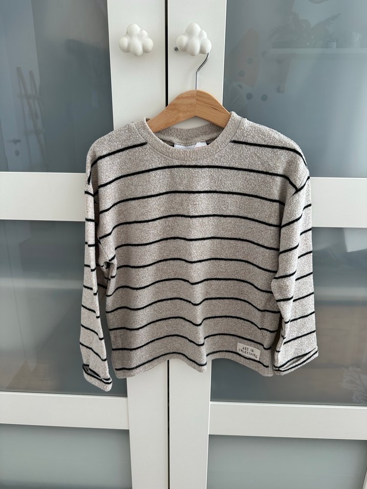 Bu erkek çocuk kazak, gevşek kesim, uzun kollu ve bisiklet yaka özelliklerine sahiptir. Yumuşak yünden üretilmiş, gri zemin üzerine ince siyah çizgilerle sade ve rahat bir stil sunar.