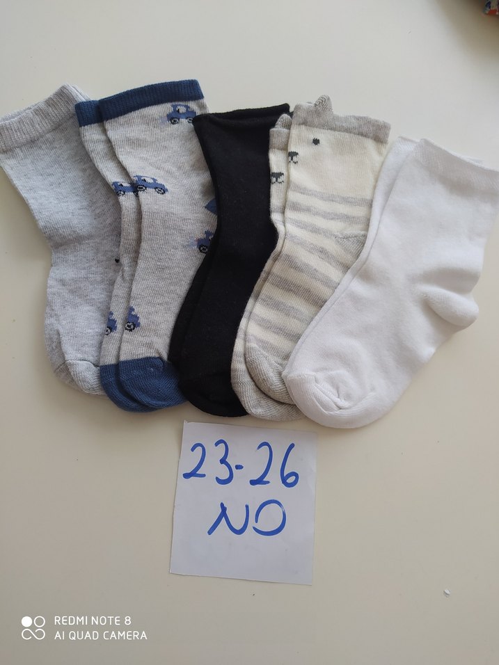 Farklı gri tonlarında, siyah ve beyaz renklerde, desenli ve düz erkek çocuk çorap seti. Numara 23-26.