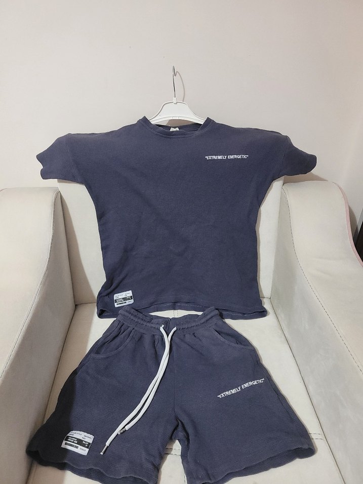 erkek cocuk için gri denim kumaştan, kısa kollu ve yuvarlak yakalı, bol kesim tişört ve şort takımı. Rahat ve trend sokak stili sunar.