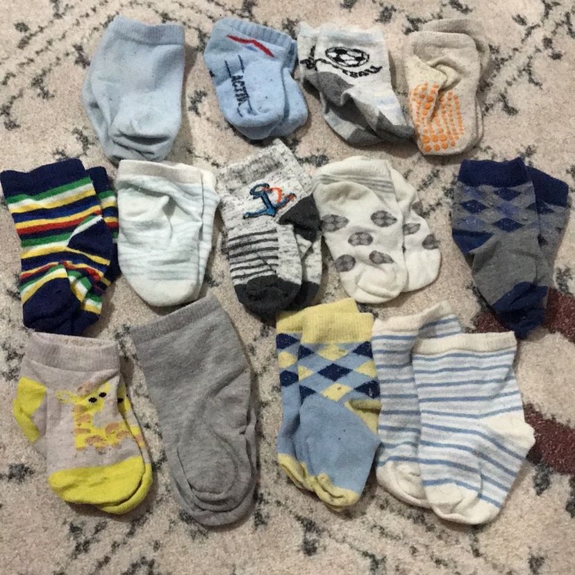 Gri tonlarda, çizgili, noktalı ve desenli farklı modellerde erkek çocuk çorapları .