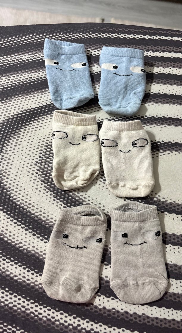 Yumuşak kumaştan, gri, mavi ve krem renklerde, gülen yüz desenli erkek çocuk çorapları seti. 0-9 ay