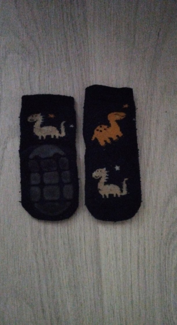 Koyu gri zemin üzerine dinozor desenleri bulunan erkek çocuk çorapları. Kaymaz tabanları hareketli çocuklar için güvenlik sağlar.