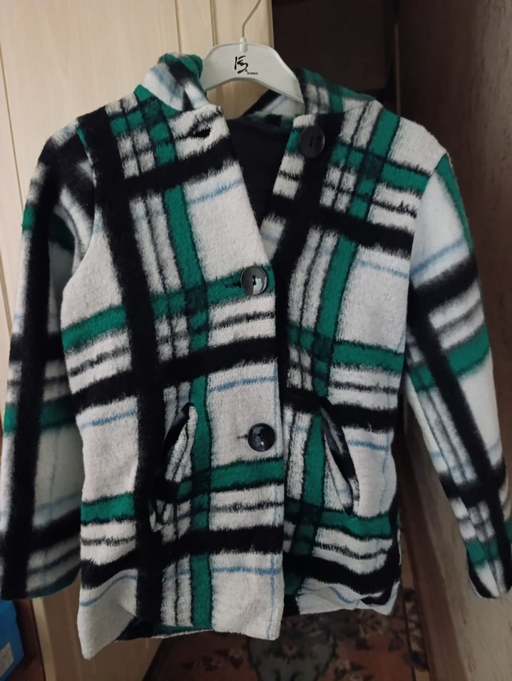 Erkek çocuk için düğmeli, kesik yaka ve ekose desenli, yumuşak ve sıcak kumaştan yapılmış bol kesim gri kaban.