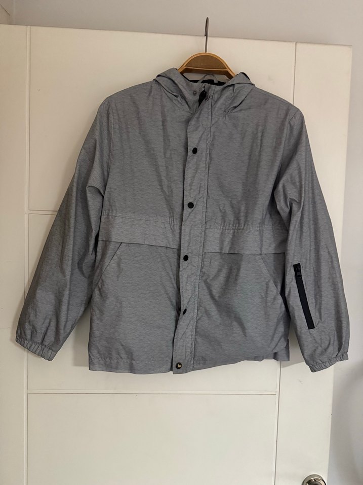 Gri renkte, regular fit ve kesik yaka detaylı erkek çocuk yağmurluk. Kapşonludur iki yana ceplidir tek kolunda fermuarlı bir cebi de bulunmaktadır. Son iki resimde gösterdim koltuk altlarındadaki sökükler vardı onlar dikilmiştir onun dışında herhangi bir başka sökük yırtık leke vs yoktur. Ölçüleri en önü kapalı olarak koltuk altından koltuk altına 49 cm, boyu omuzdan itibaren 60 cm, kol boyu da omuzdan itibaren 54 santimetredir.