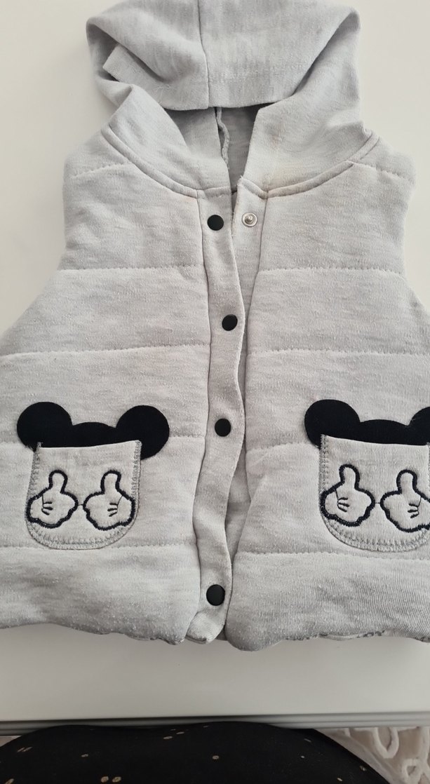 Düğmeli, kapüşonlu erkek çocuk yeleği, yumuşak ve sıcak kumaştan, dar kesim. Nakışlı ceplerde eğlenceli desenler bulunur. Kalın elyafli yelek 4 defa kullanıldı.