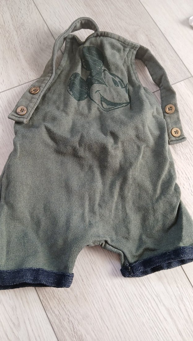Gri renkli, düğmeli askılı, bol kesim kot tulum. Mickey Mouse baskılı, kolsuz ve sokak stili için uygun.